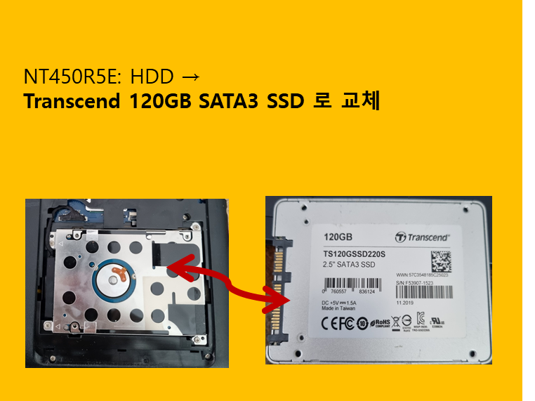 - NT450R5E: HDD → Transcend 120GB SATA3 SSD (TS120GSSD220S)