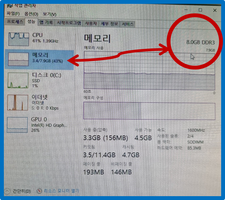 - 작업 관리자 확인: SSD 및 RAM 용량 제대로 인식됨
