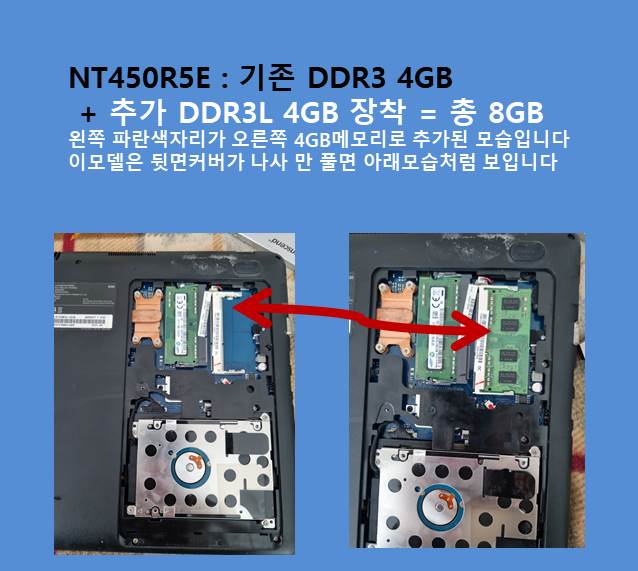- NT450R5E: 기존 DDR3 4GB + 추가 DDR3L 4GB 장착